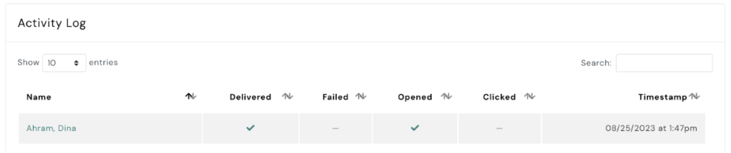 - View Activity Log: Within the email details, scroll down to find the ‘Activity Log.’ This log provides information about which clients received, opened, and clicked within the email.