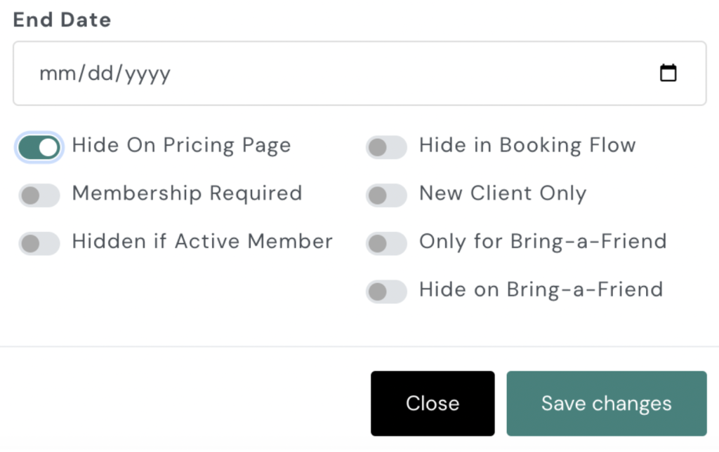 - Toggle on the “Hide on Pricing Page” option while adding or editing the pricing item.