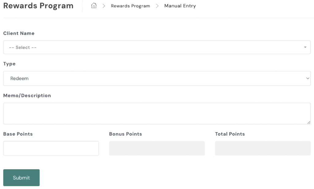- Once the form is filled out, click Submit to deduct the points from the client’s account.