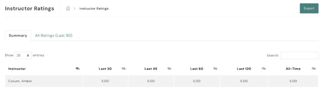 Here, you can see instructor ratings over time. To review individual ratings received by each client, select ‘All Ratings’.